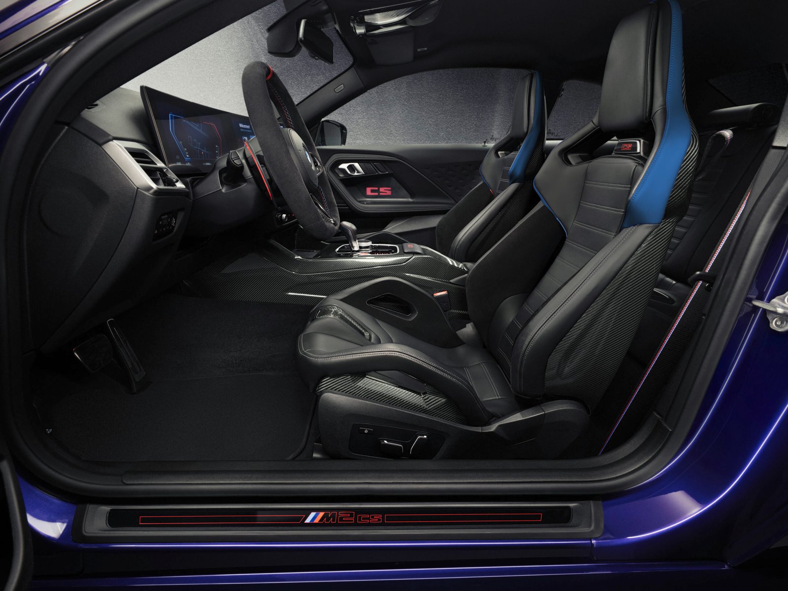 Pas de fioritures sur la M2 CS : chaque élément de design répond à une fonction. Le splitter avant, la calandre noire spécifique, le diffuseur arrière et le becquet façon queue de canard ne sont pas là que pour le show : ils participent à la stabilité à haute vitesse. Les quatre coloris disponibles, dont le Bleu Velours métallisé BMW Individual, renforcent le caractère exclusif de cette édition limitée. Et que dire des phares M Shadowline ? Leur regard sombre souligne une identité visuelle aussi musclée qu’élégante.