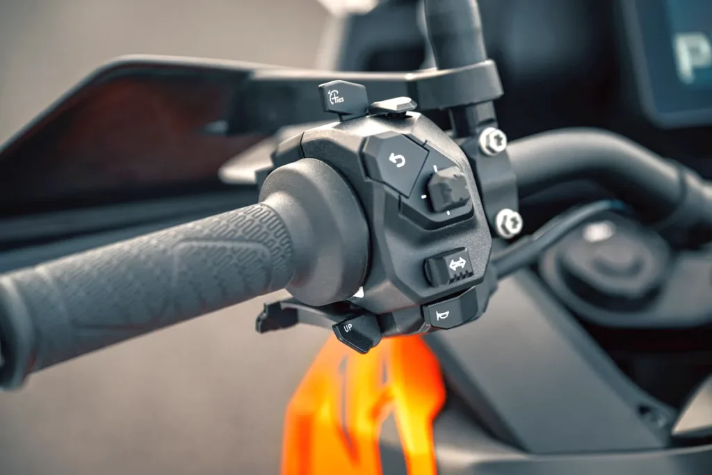 Autre particularité notable : contrairement à une boîte manuelle classique dont la séquence commence à N-1-2-3…, l’AMT KTM adopte une logique P-N-1-2-3-4-5-6, avec une position Park (verrouillage par cliquet interne) pour immobiliser la moto sans béquille latérale sollicitée. Park et Neutral ne sont accessibles que via les palettes au guidon, jamais au pied.